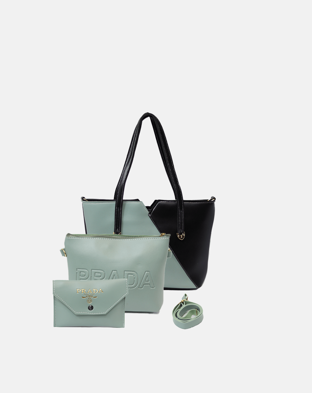 Stylish 3-piece tote handbag set. This is really versatile as it has a tote, a clutch, and a small pouch perfect for any occasion. And also, with its trendy Mint Green Black color combination, everything is there, from what you need to be organized.