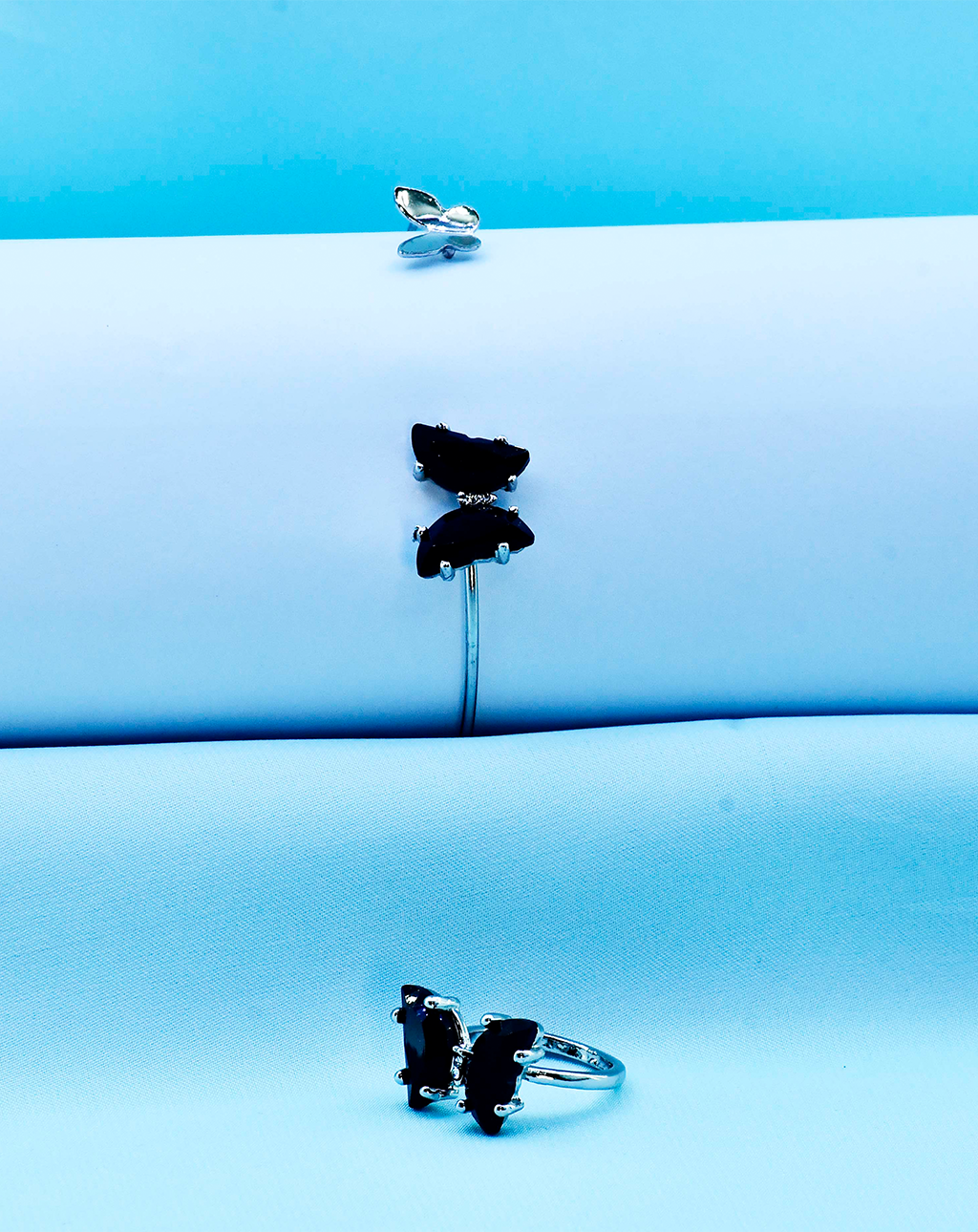 This elegant set consists of a pair of butterfly-inspired pieces: a ring and a bracelet. The cut black stones have given both of these pieces an air of mystery and sophistication. Delicate butterfly design in silver tone will give a modern look with a style. It is a perfect set to add some whimsy to any outfit.