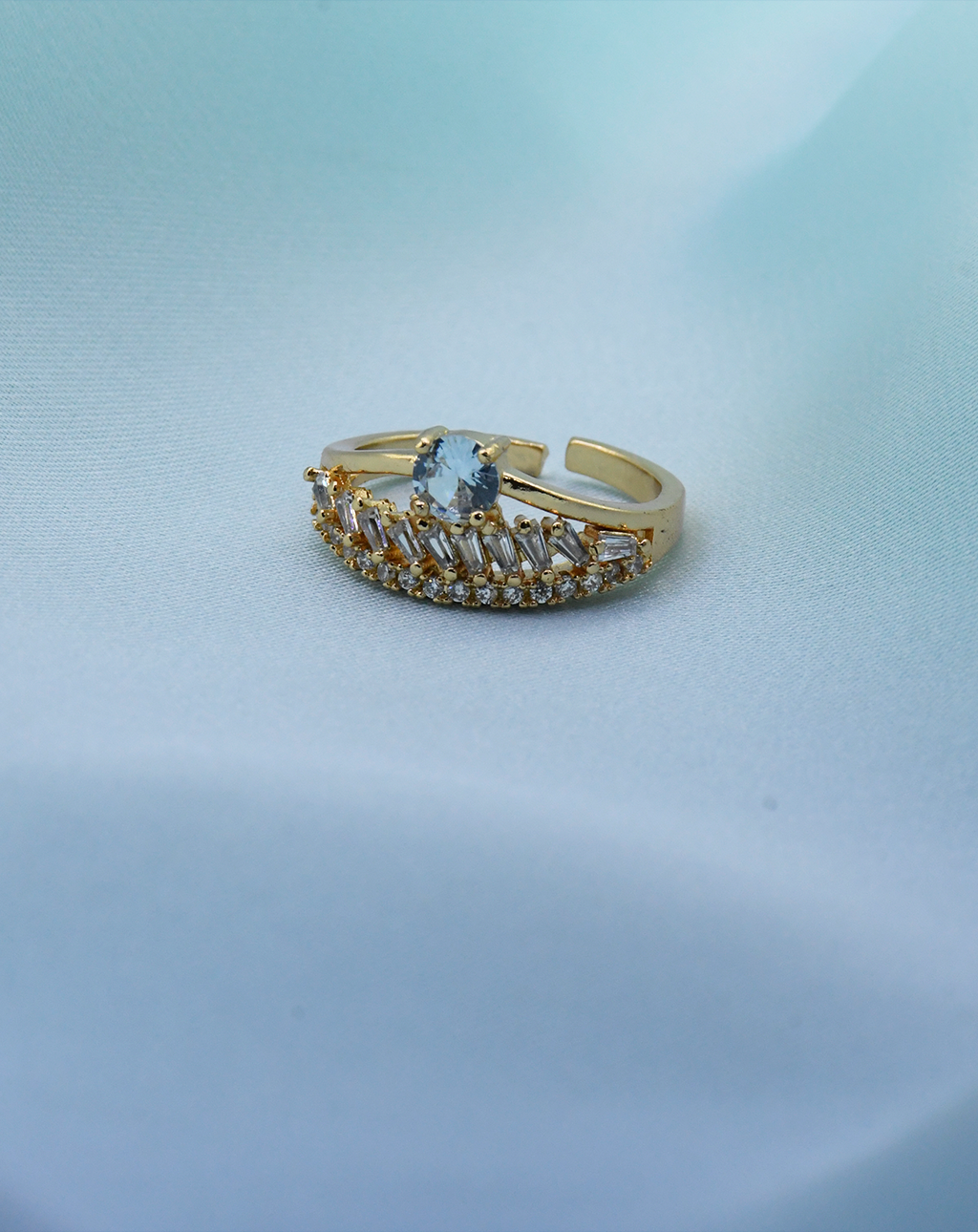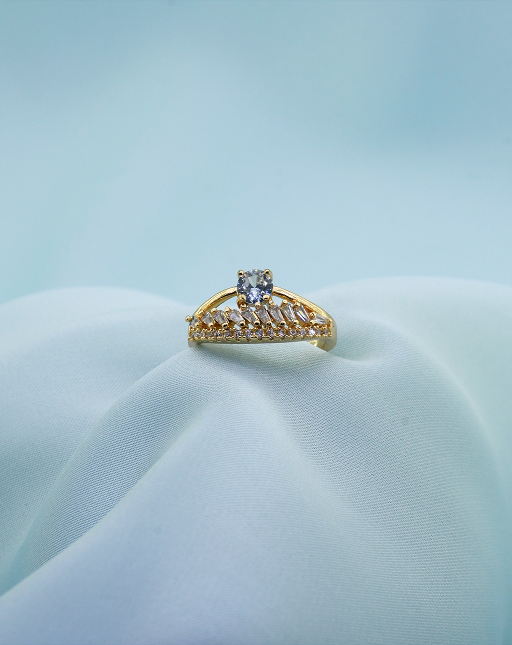 Such a beautiful cubic zirconia flower-shaped ring boasts a sparkling round-cut cubic zirconia stone set in a crowning design. Smaller more baguette-cut stones adorn its brilliant band providing an overall dazzling and sophisticated appearance. The gold-toned finish puts finishing touches on this royal jewel.