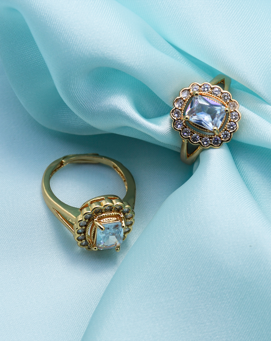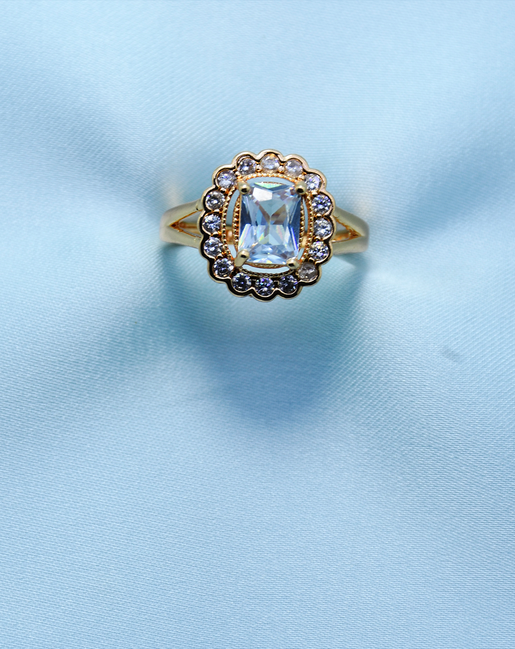 This lovely ring is surrounded with a glittering halo of sparkling small cubic zirconia stones. Centered in the middle is a clear, cut cubic zirconia stone in radiant rectangular shape. The gold band offers a classic touch to the ring. Thus, it is elegant and sophisticated and fits any occasion.