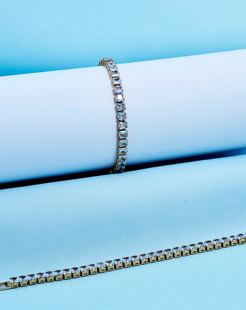 A beautiful and glamorous bracelet in a string of White Square zirconia stones set within a sleek gold-plated chain, heralding the return of classic style, timeworn sophistication, and glamour.